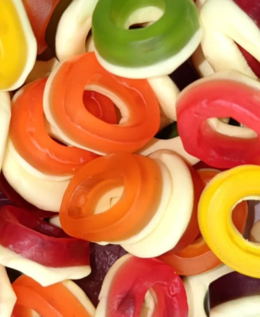 Gliukozės sirupas; cukrus; dekstrozė; želatina; pagalbinė medžiaga: citrinų rūgštis; vaisių ir augalų koncentratai: obuolių, aronijų, juodųjų serbentų, šeivamedžio uogų, vynuogių, citrinų, mangų, apelsinų, pasiflorų, dygminų, spirulinos; saulėgrąžų aliejus; kvapiosios medžiagos: glazūros medžiaga: bičių vaškas; karamelizuoto cukraus sirupas; šeivamedžio uogų ekstraktas.