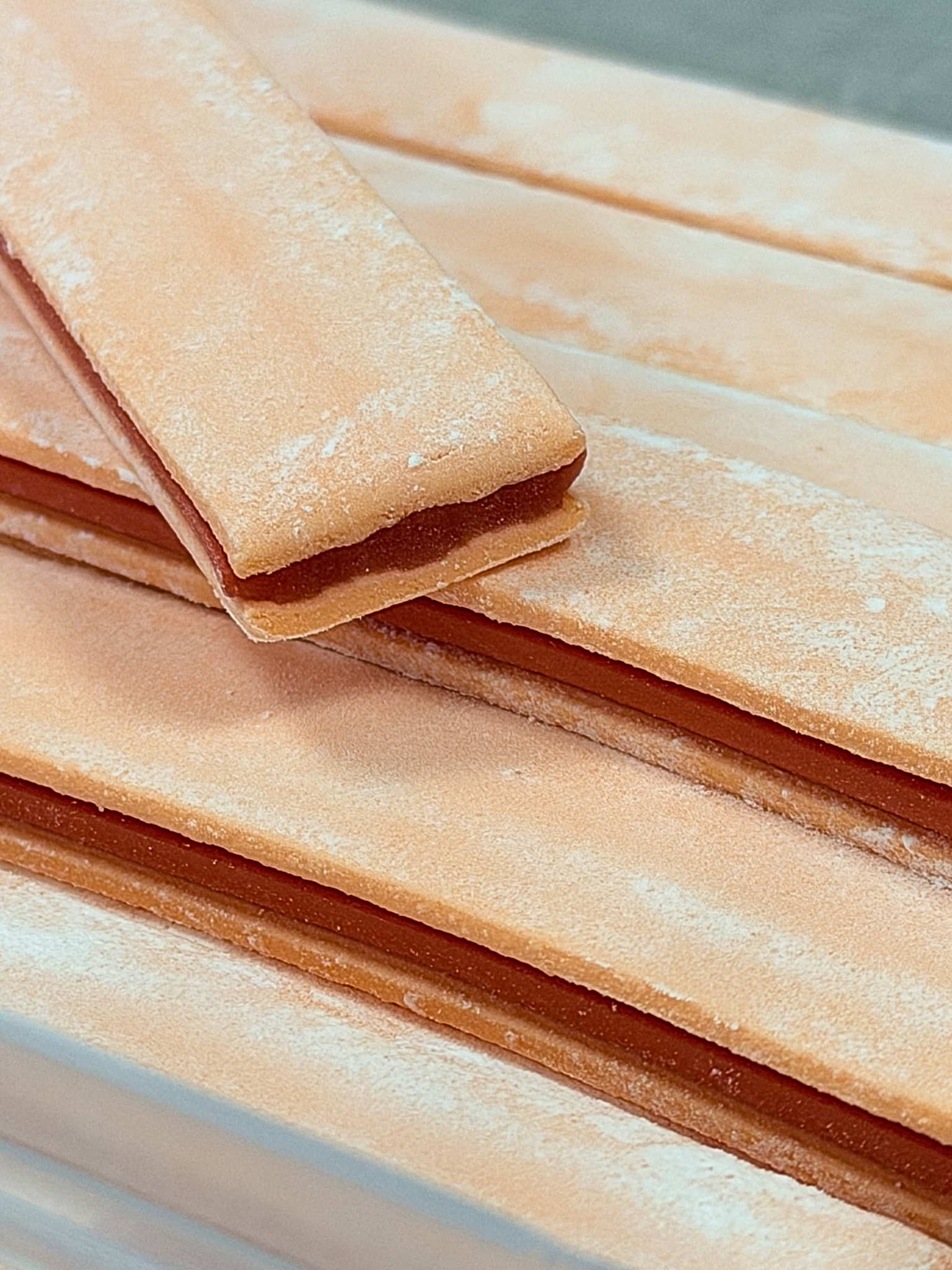 MAXI SUMUŠTINIAI GUMINUKAI – tai skanūs guminukai, kurių forma primena ilgas juosteles, o tarp jų paslėptas gardus braškių skonio įdaras.
