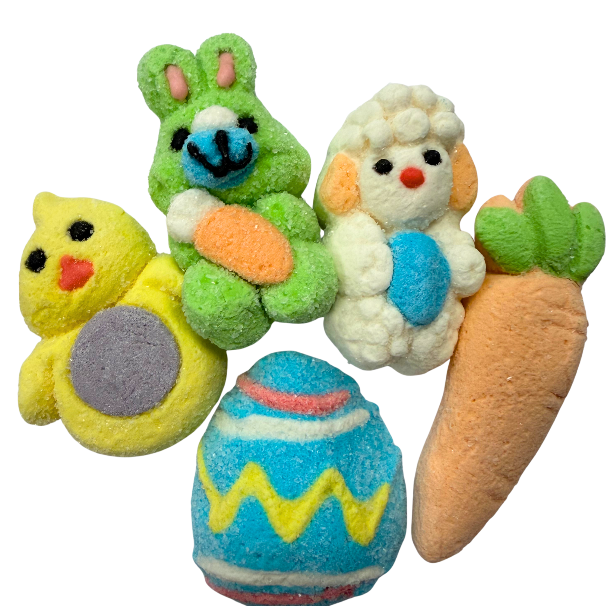 Labai gražūs, vidutinio dydžio zefyrai, pabarstyti plonu cukraus sluoksniu. įvairių dizainų: Velykiniai kiaušiniai, zuikučiai, ėriukai ir viščiukai.
